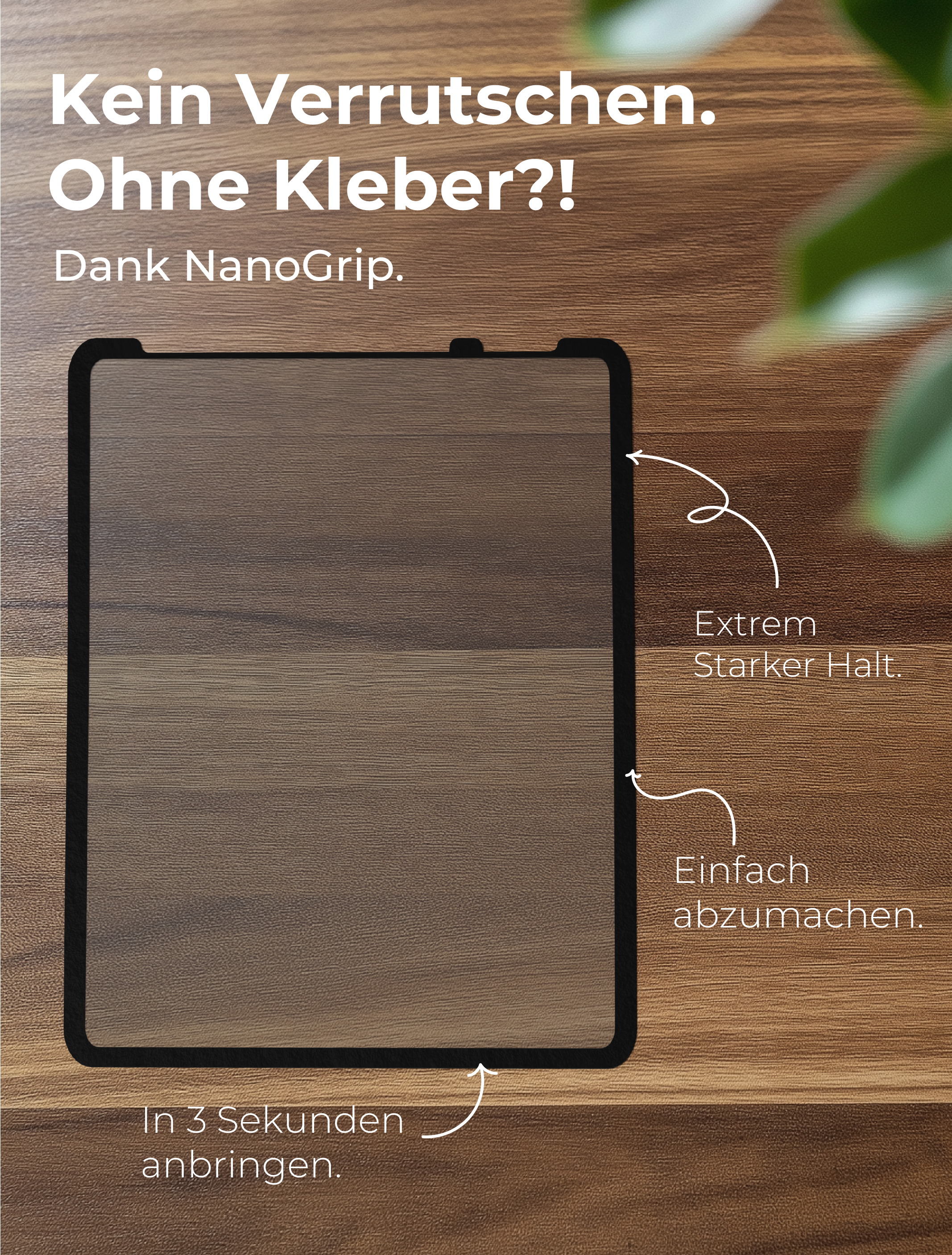 1. Die Nano-Grip Anti-Rutschbeschichtung sorgt dafür, dass die Folie rutschfest auf deinem iPad haftet – ganz ohne Blasenbildung und ohne Magnetstreifen. ✨